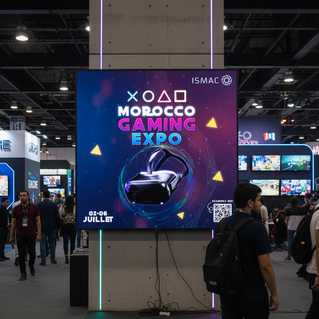 Création de l’ensemble du design digital et print pour ISMAC lors de la Moroccan Gaming Expo : t-shirts, flyers, visuels pour écrans et roll-ups, assurant une identité visuelle cohérente et impactante pour l’institut.